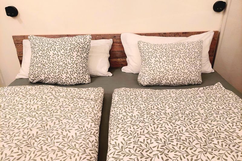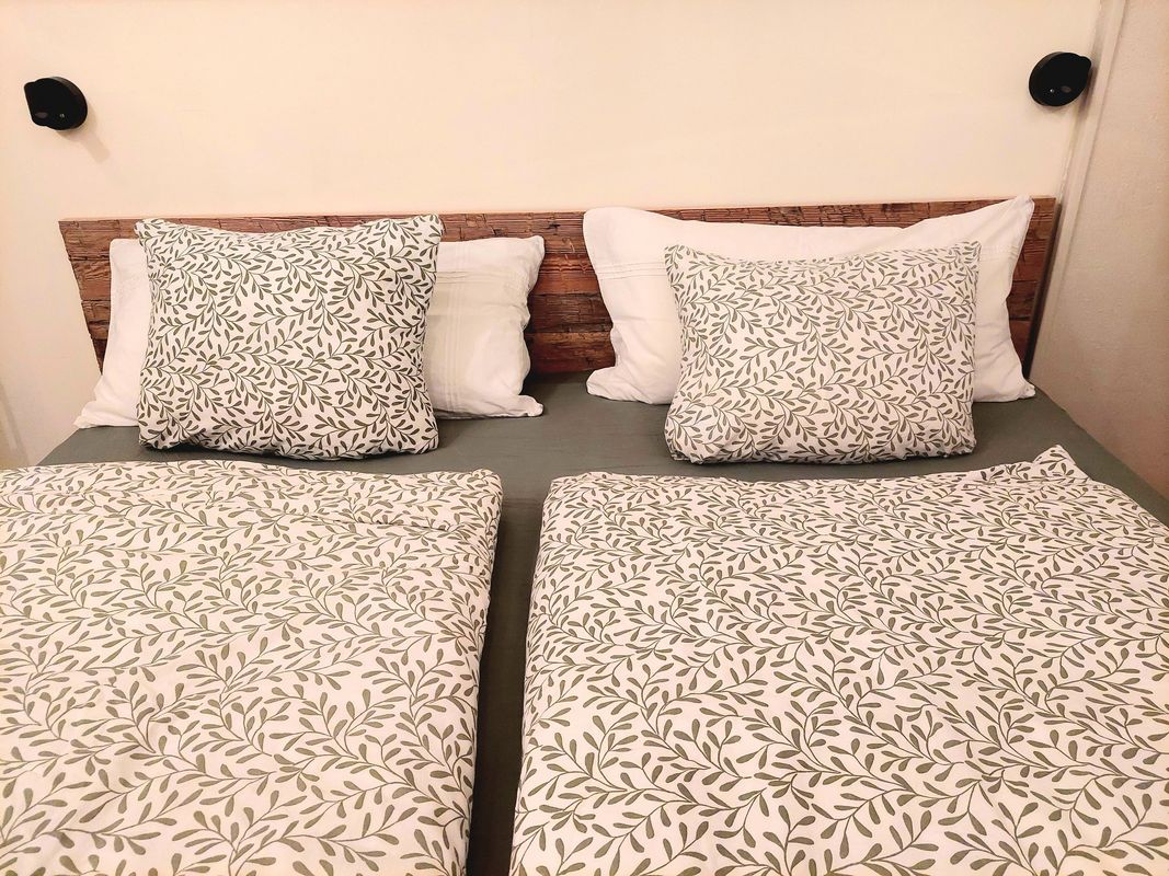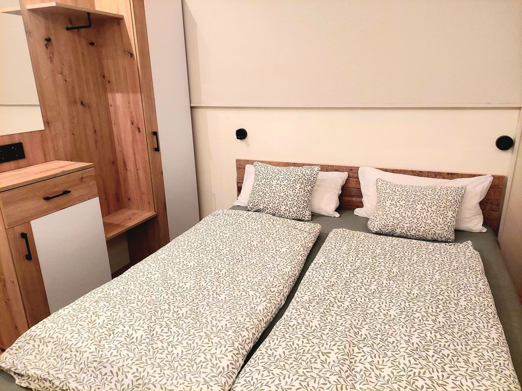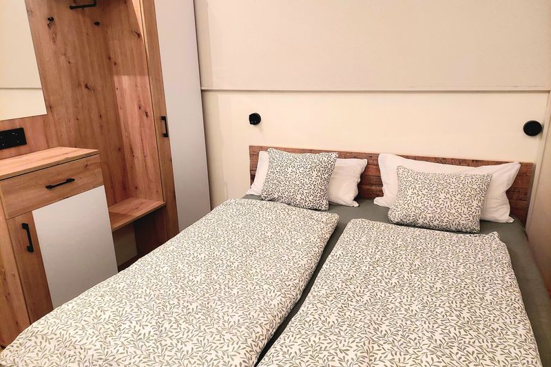 Schlafzimmer: Das separate Schlafzimmer bietet durch ein Doppelbett mit viscoelastischer Matratze größten Komfort. Im kombinierten Wohn- und Schlafzimmer befinden sich ein Doppelbett sowie eine Couchliege. Hier findet sich auch eine Wohnwand mit genügend Stauraum.